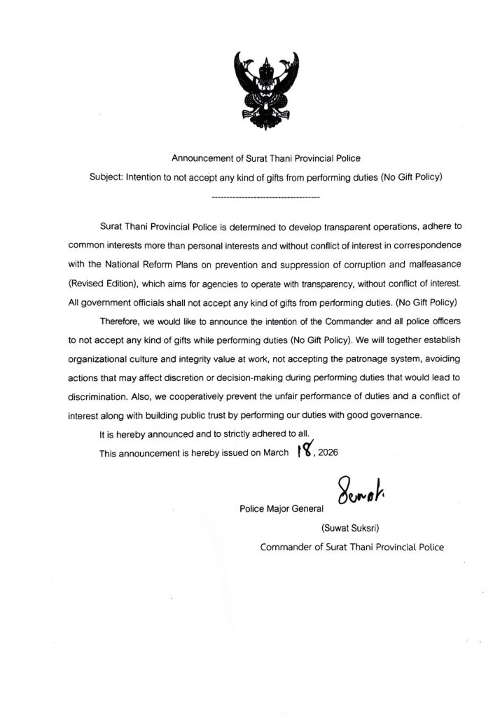 วันนี้ (12 มี.ค. 69) เวลา 09.30 น. พล.ต.ต.สุวัฒน์ สุขศรี ผบก.ภ.จว.สุราษฎร์ธานี มอบหมา